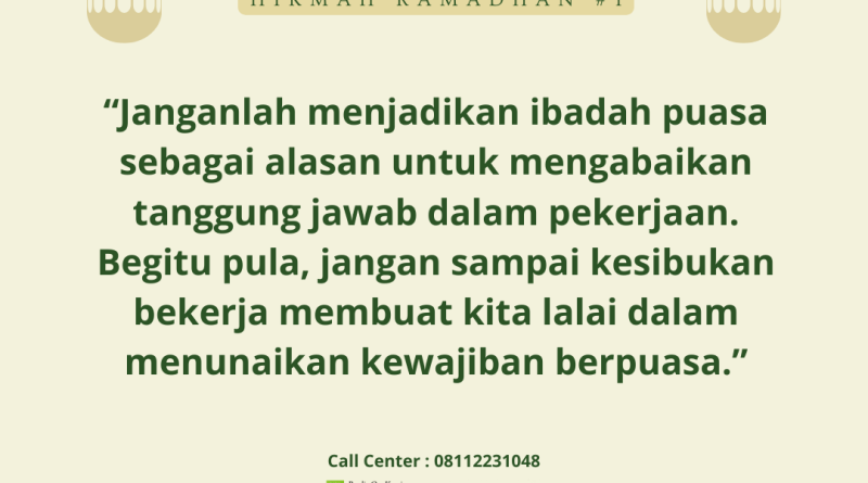 “Janganlah menjadikan ibadah puasa sebagai alasan untuk mengabaikan tanggung jawab dalam pekerjaan. Begitu pula, jangan sampai kesibukan bekerja membuat kita