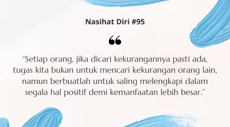 “Setiap orang, jika dicari kekurangannya pasti ada, tugas kita bukan untuk mencari kekurangan orang lain, namun berbuatlah untuk saling melengkapi dalam segala hal positif demi kemanfaatan lebih besar.”