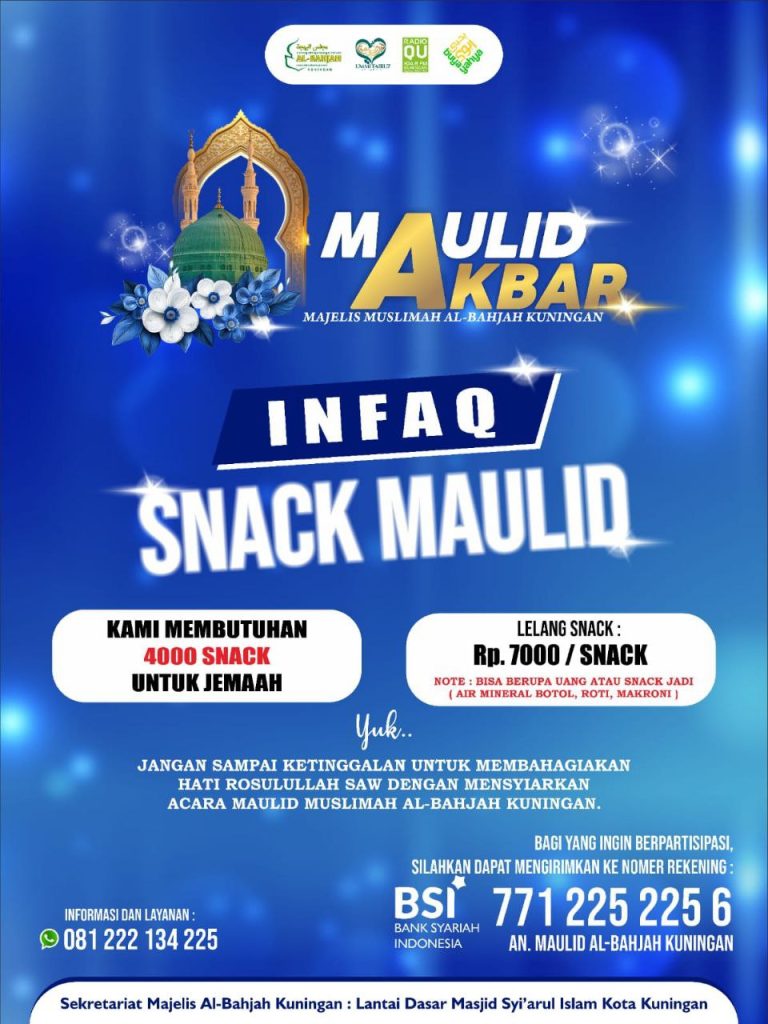 Yuk, ikut bahagiakan hati Rasulullah ﷺ dengan berinfaq snack untuk jamaah Maulid Akbar Al-Bahjah Kuningan! 💖