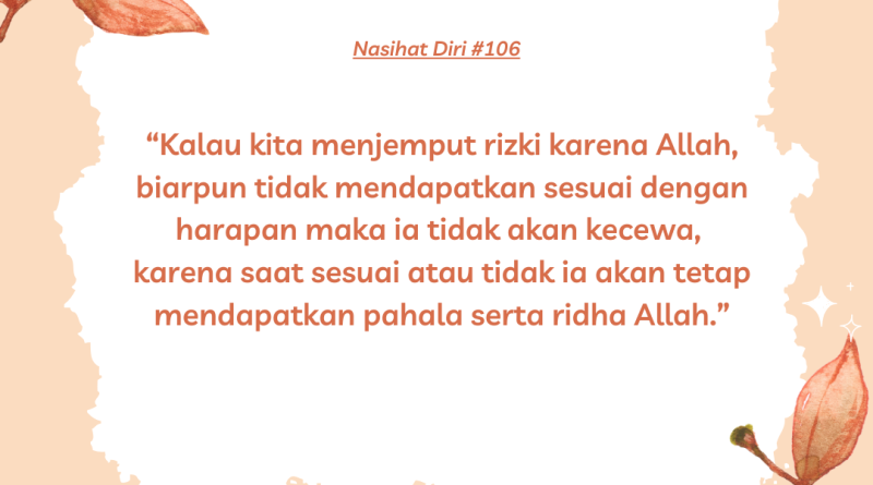 “Kalau kita menjemput rizki karena Allah, biarpun tidak mendapatkan sesuai dengan harapan maka ia tidak akan kecewa, karena saat sesuai atau tidak ia akan tetap mendapatkan pahala serta ridha Allah.”